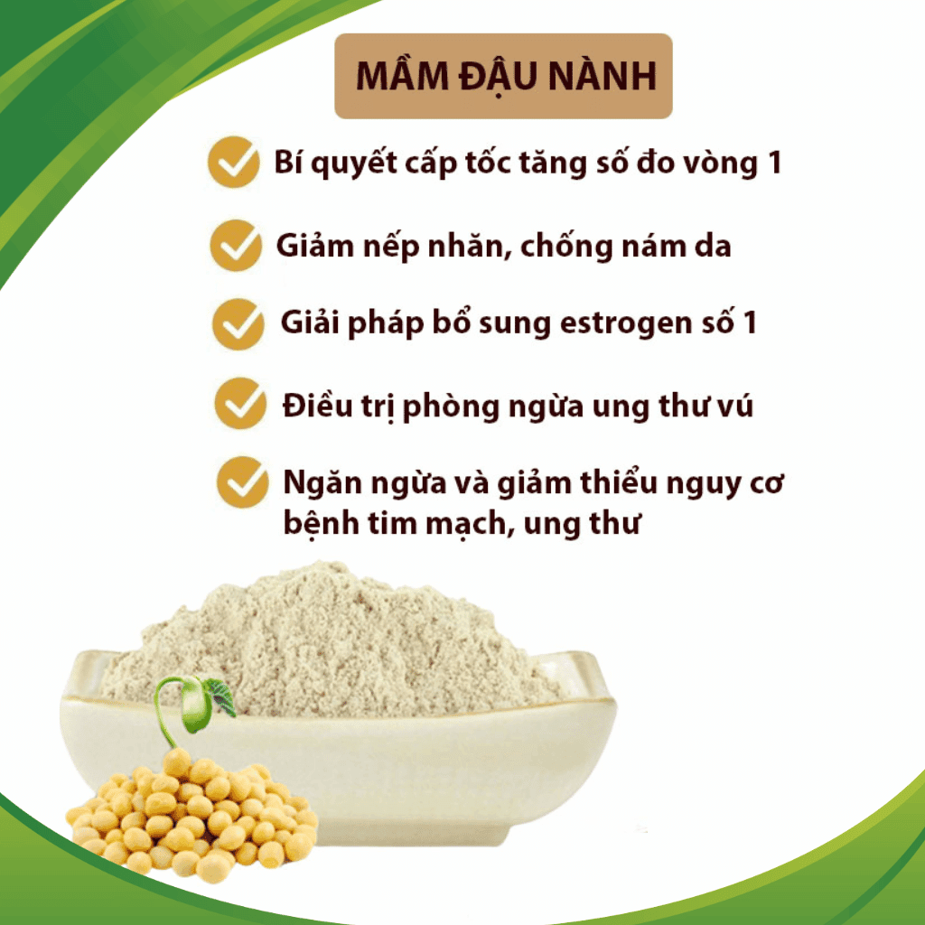 Nhiều chị em gặp tình trạng nám da, khô hạn, hoặc bốc hỏa tiền mãn kinh mà không biết rằng cơ thể đang thiếu hụt trầm trọng Estrogen. Mầm đậu nành (hay đậu nành mọc mầm) chứa hàm lượng Isoflavone cao gấp nhiều lần hạt đậu thông thường, giúp hỗ trợ bù đắp lượng thiếu hụt này một cách tự nhiên.